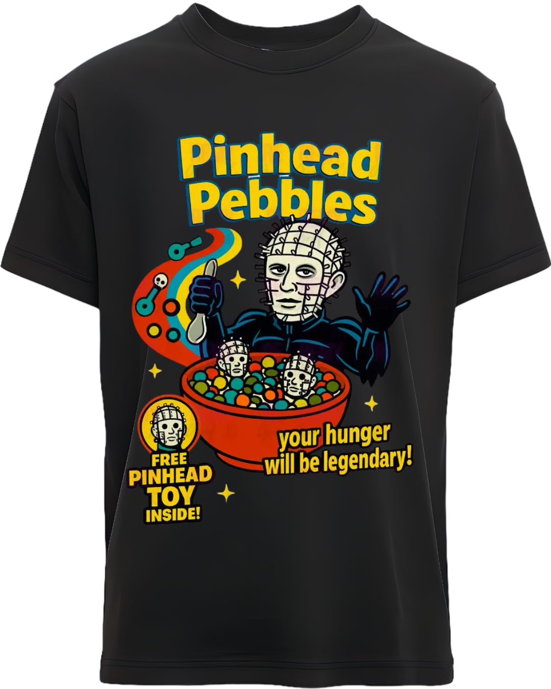 Summon some deliciously dark nostalgia with Pinhead Pebbles™, a retro cereal box parody that blends Saturday-morning cheer with pure horror icon energy. Reimagining the legendary Cenobite as the smiling (and slightly menacing) mascot of his very own breakfast cereal, this design is a must-have for horror fans, parody lovers, and Halloween addicts.