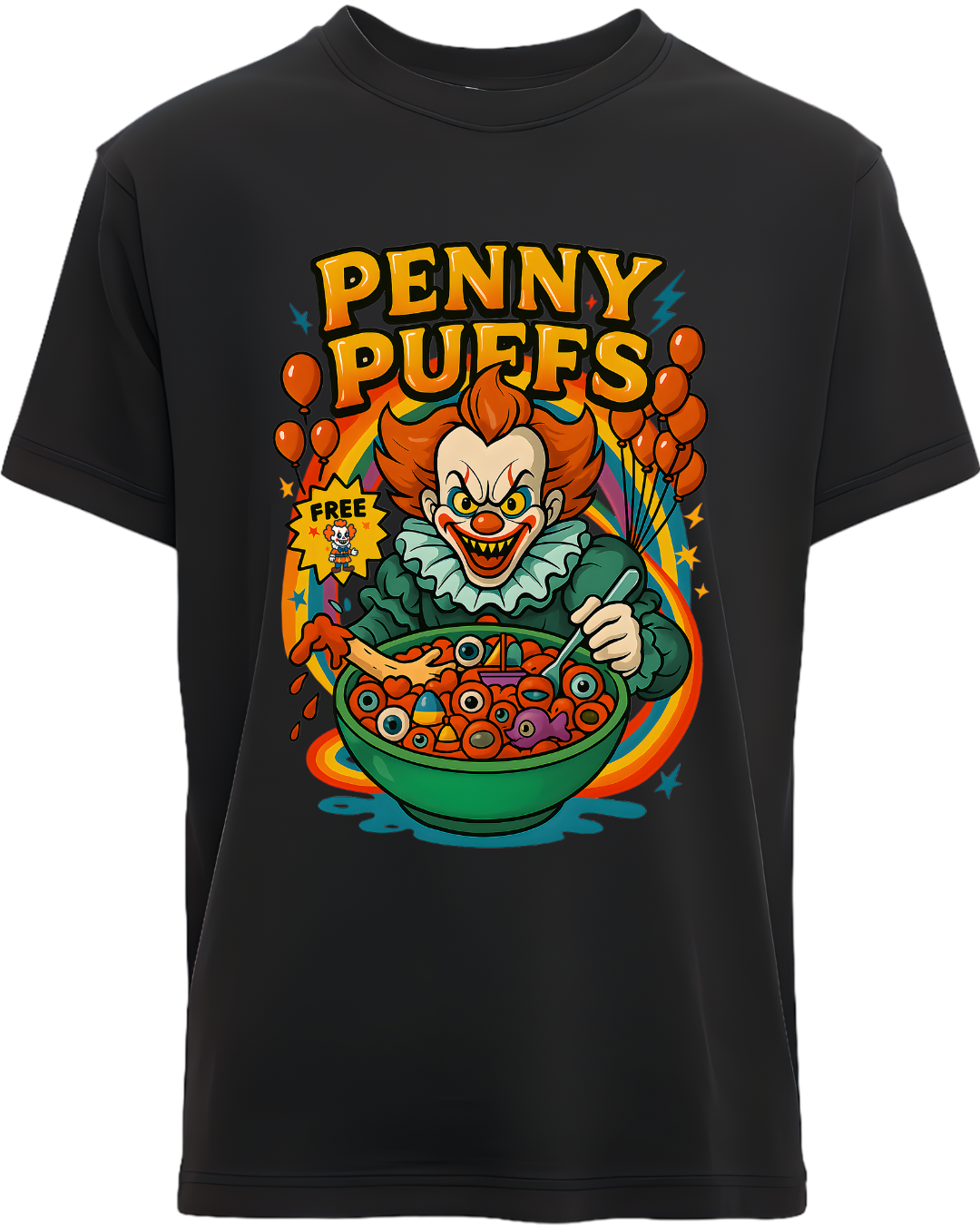 This t-shirt captures that playful, eerie, retro-horror vibe perfectly — blending Saturday-morning cereal nostalgia with just the right dose of creeping dread. It’s bright, weird, and unsettling in the best possible way.